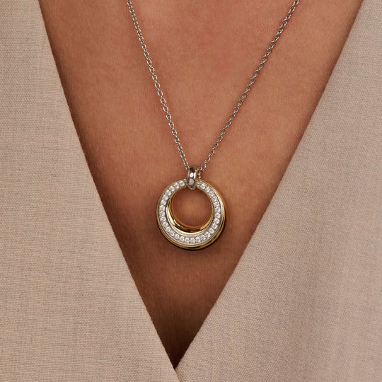 Deze zilveren ketting met goudkleurige cirkelvormige hanger is vervaardigd uit hoogwaardige kwaliteit 925 sterling zilver en heeft een verfijnd, tijdloos ontwerp. De cirkelvormige hanger is uitgevoerd in een goudkleurige kleur en bezet met een rij zirkonia steentjes, die zorgen voor een subtiele schittering. De open ruimte in het midden geeft het ontwerp extra diepte en versterkt het lichte, elegante karakter van de ketting.