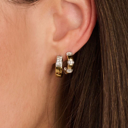 De Vintage Zirkonia Oorbellen in goudkleurige design zijn vervaardigd uit hoogwaardige kwaliteit 925 sterling zilver en afgewerkt met een warme goudkleurige laag. Het ontwerp is opgebouwd uit horizontale rijtjes zirkonia steentjes, die zorgvuldig zijn gezet en mooi contrasteren met de gladde goudkleurigee vlakken. Door de halfronde vorm vallen de oorbellen elegant en comfortabel om de oor.